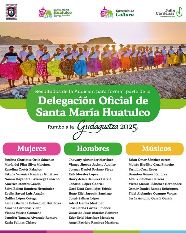 El Gobierno Municipal de Santa María Huatulco, a través de la Dirección de Cultura, se enorgullece en presentar la lista oficial de seleccionados que formaran parte de la Delegación Cultural de Santa María Huatulco y que representarán a nuestro municipio en la Guelaguetza 2025.