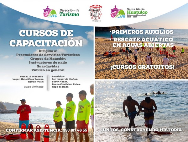El Gobierno Municipal de Santa María Huatulco, que encabeza el Ing. Julio Cárdenas, a través de la Dirección de Turismo, en coordinación con la Dirección de Protección Civil y Bomberos, invita a la Jornada de capacitaciones donde realizarán Cursos de Primeros Auxilios y Rescate Acuático en Aguas Abiertas, dirigido a prestadores de servicios turísticos, grupos de natación, instructores de nado, guardavidas y público en general, el 24 de marzo, a las 8:00 am, en el Hotel Casa Bocana, ubicado a metros de la playa La Bocana.