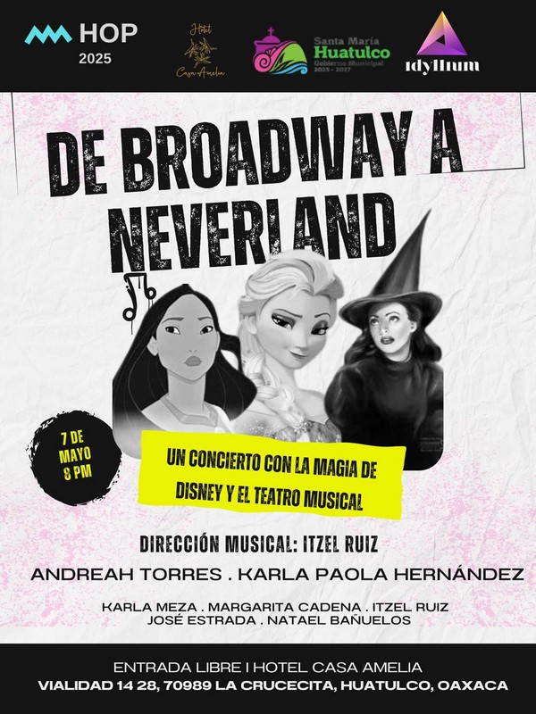 El Gobierno Municipal de Santa María Huatulco, que preside el Ing. Julio Cárdenas, invita a vivir una noche inolvidable con “De Broadway a Neverland”, un espectáculo que nos transporta de los escenarios más icónicos del teatro a los mundos de fantasía que marcaron generaciones.