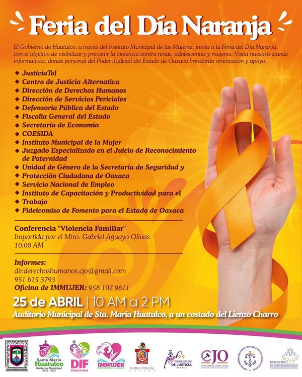 El Gobierno Municipal de Santa María Huatulco, que preside el Ing. Julio Cárdenas, a través del Instituto Municipal de las Mujeres, te invita este 25 de abril al Auditorio Municipal (a un costado del lienzo charro), de 10:00 a 14:00 hrs, a una jornada con servicios, orientación y la conferencia “Violencia Familiar”.