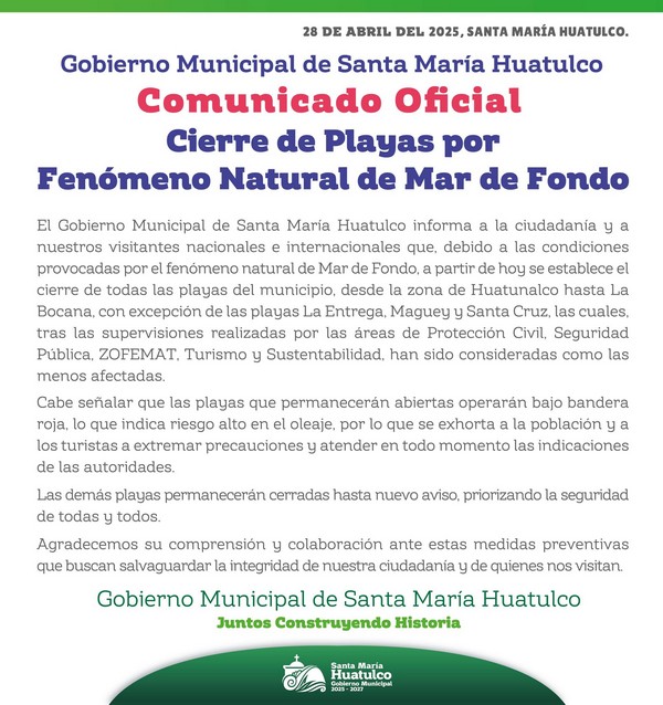 Por fenómeno natural de Mar de Fondo, el Gobierno Municipal de Santa María Huatulco informa el cierre de playas desde Huatunalco hasta La Bocana, a excepción de La Entrega, Maguey y Santa Cruz, que permanecerán abiertas con bandera roja.