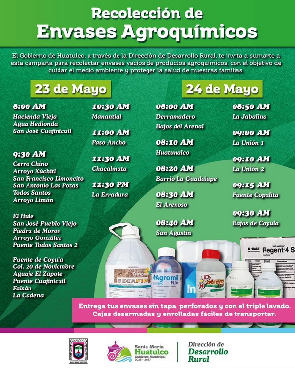 El Gobierno de Santa María Huatulco que preside el Ing. Julio Cárdenas, a través de la Dirección de Desarrollo Rural, invita a productoras y productores a participar en la campaña de recolección de envases vacíos de agroquímicos, este 23 y 24 de mayo, en distintas comunidades del municipio.