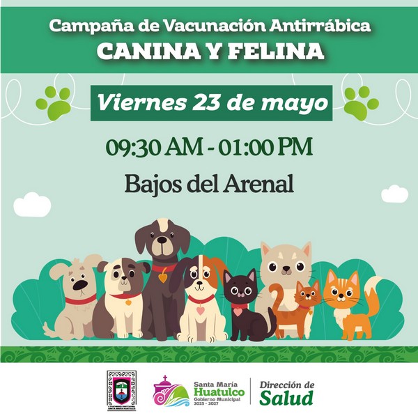 El Gobierno de Santa María Huatulco que preside el Ing. Julio Cárdenas, a través de la Dirección de Salud, invita a toda la comunidad perteneciente a Bajos del Arenal a participar en la Campaña de Vacunación Antirrábica, destinada a perros y gatos.