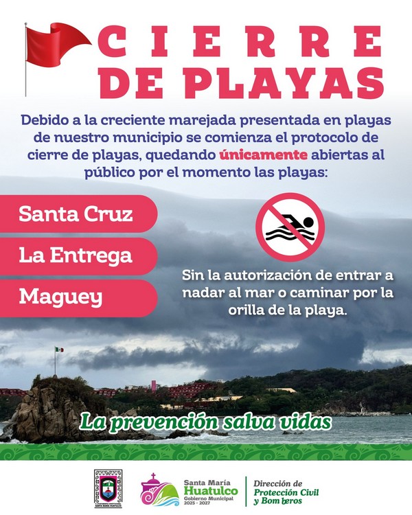 Debido a la creciente marejada presentada en playas de nuestro municipio, se inicia el protocolo de cierre de playas, dejando abiertas al público únicamente: Santa Cruz, La Entrega y Maguey, sin la autorización de entrar a nadar o caminar por dichas playas.