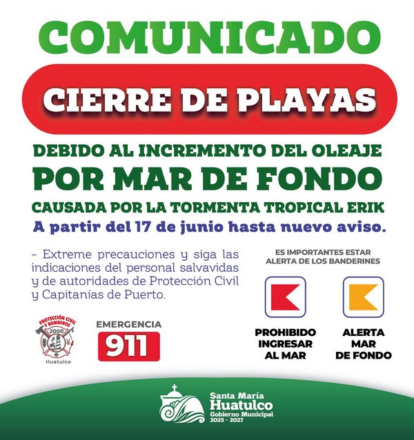 La Direcci贸n de Protecci贸n Civil y Bomberos de Huatulco informa a la ciudadan铆a y visitantes que, debido al incremento del oleaje ocasionado por el fen贸meno de mar de fondo y la marejada generada por la tormenta tropical Erik, se ha determinado el cierre total de playas como medida preventiva para proteger la integridad de la poblaci贸n.