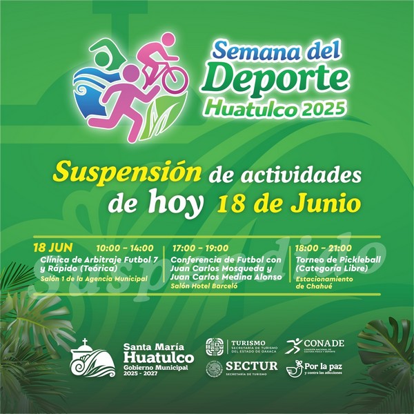 El Gobierno Municipal de Santa María Huatulco informa a la ciudadanía que, debido a las condiciones meteorológicas actuales, quedan suspendidas todas las actividades programadas para este miércoles 18 de junio en el marco de la Semana del Deporte Huatulco 2025.