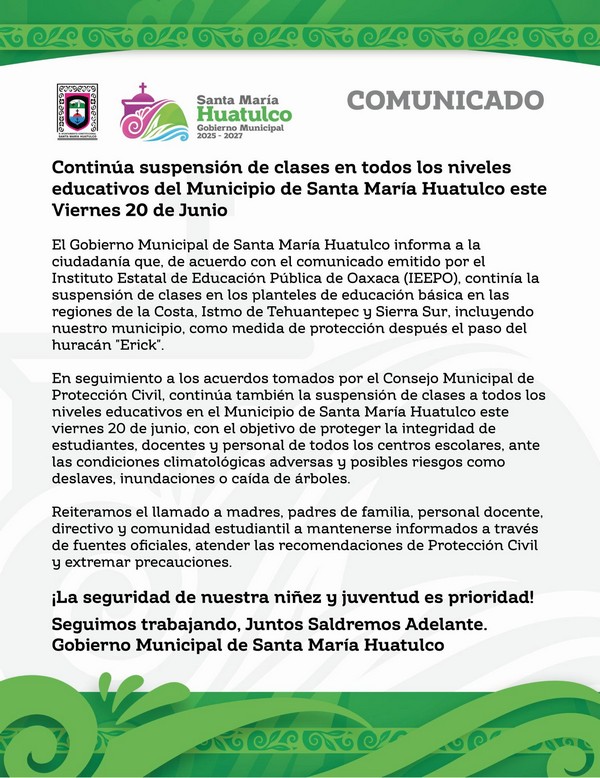 Continua suspensión de clases en todos los niveles educativos del Municipio de Santa María Huatulco este Viernes 20 de Junio