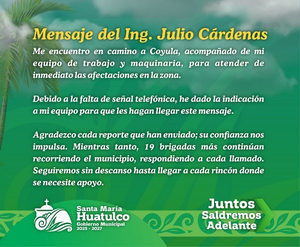 Mensaje del Presidente Municipal Ing. Julio Cesar Cárdenas Ortega Navegación de entradas Trabajamos para habilitar los accesos afectados por el huracán Erick Liberamos el paso en el sector H3 tras afectaciones por huracán Erick