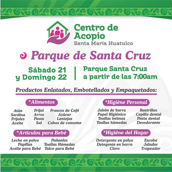 El Gobierno Municipal de Santa María Huatulco, que preside el Ing. Julio Cárdenas, informa a la ciudadanía que se habilitará un centro de acopio en el Parque de Santa Cruz los días sábado 21 y domingo 22 de junio, a partir de las 7:00 a.m.