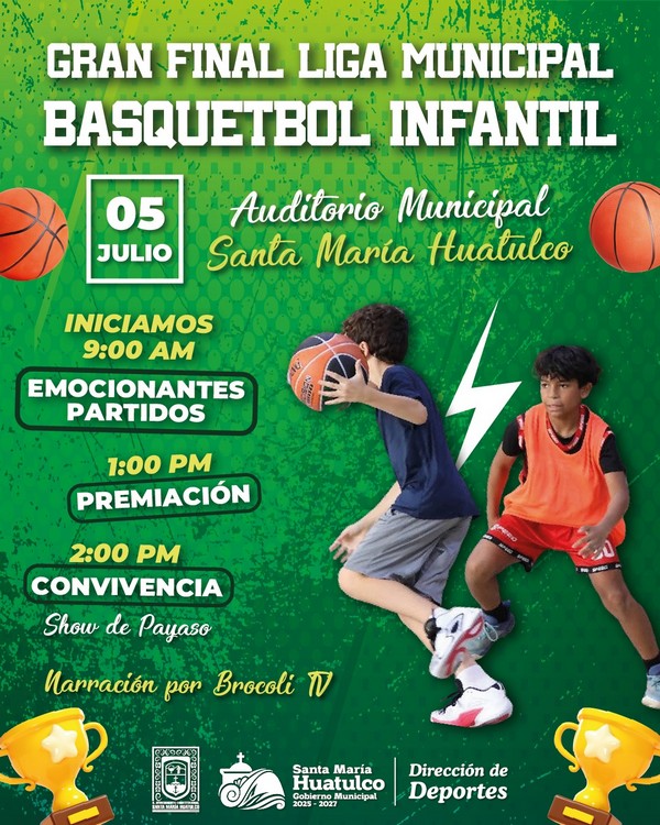 El Gobierno Municipal de Santa María Huatulco, a través de la Dirección de Deportes, invita a la ciudadanía a disfrutar de la gran final de la Liga Municipal de Basquetbol Infantil.