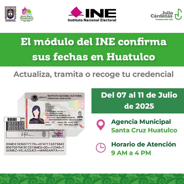 El Gobierno Municipal de Santa María Huatulco invita a la comunidad a acudir al módulo del Instituto Nacional Electoral (INE), el cual estará disponible para brindar atención en actualización, trámite o entrega de credenciales.