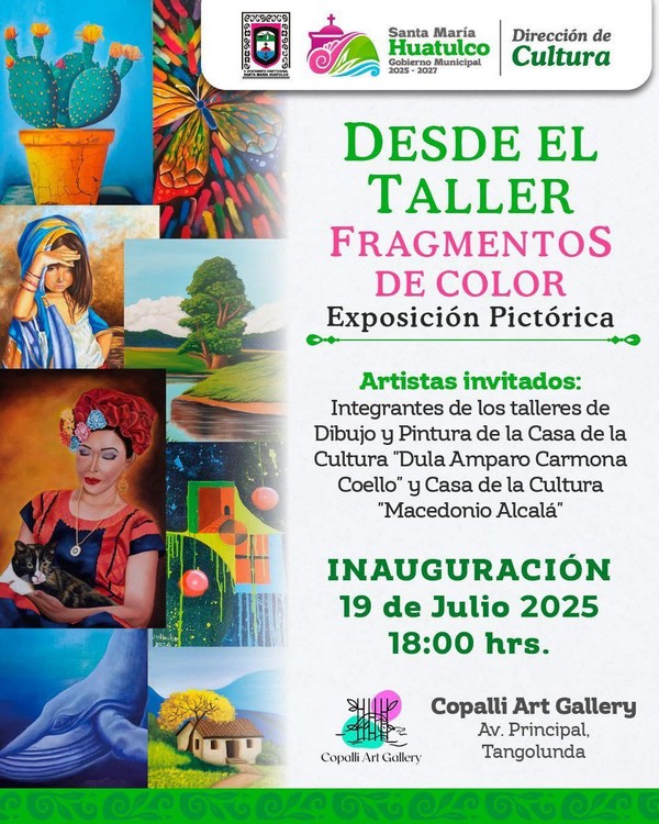 El Gobierno Municipal de Santa María Huatulco, que preside el Ing. Julio Cárdenas, a través de la Dirección de Cultura, invita a la ciudadanía a asistir a la exposición pictórica «Desde el Taller: Fragmentos de Color».