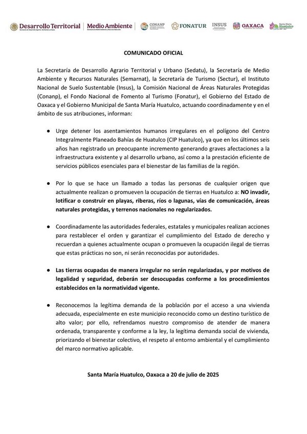 Exhortamos a la ciudadanía a no dejarse engañar por quienes promueven asentamientos irregulares. En Huatulco, la legalidad y la protección de nuestro entorno son principios fundamentales que deben respetarse.