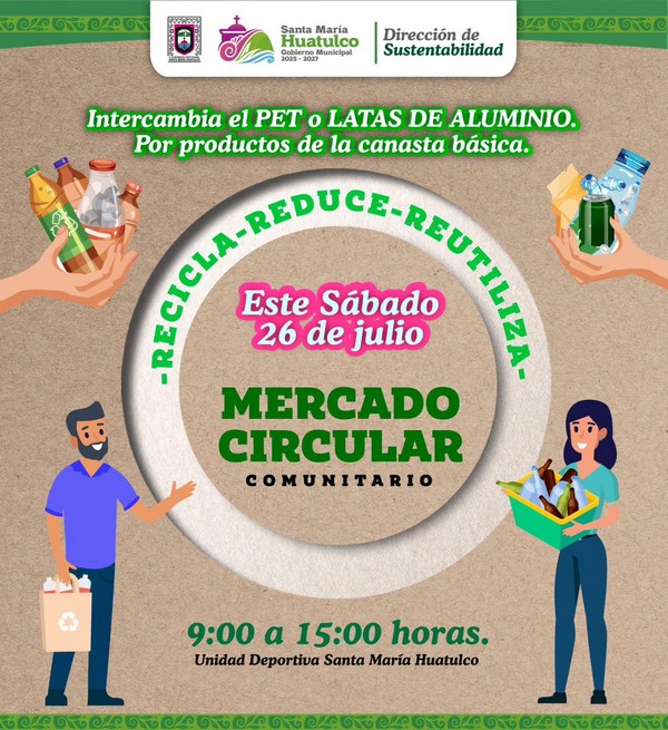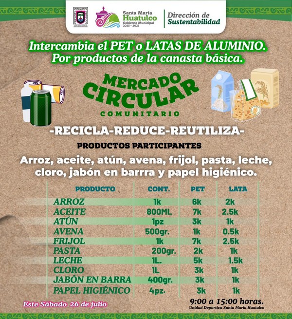 El Gobierno Municipal de Santa María Huatulco, que preside el Ing. Julio Cárdenas, a través de la Dirección de Sustentabilidad, invita a la ciudadanía a participar en el intercambio de PET o latas de aluminio por productos de la canasta básica.
