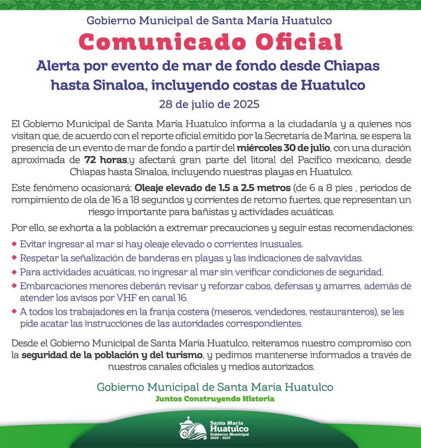 El Gobierno Municipal de Santa María Huatulco informa a la ciudadanía que, de acuerdo con el reporte oficial emitido por la Secretaría de Marina, se espera la presencia de un evento de mar de fondo a partir del miércoles 30 de julio, con una duración aproximada de 72 horas.