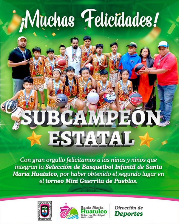 El Gobierno Municipal de Santa María Huatulco, que preside el Ing. Julio Cárdenas, a través de la Dirección de Deportes, extiende una cálida felicitación a las niñas y niños que integran la Liga de Basquetbol Infantil de Santa María Huatulco, por haber obtenido el segundo lugar en el torneo Mini Guerrita de Pueblos.