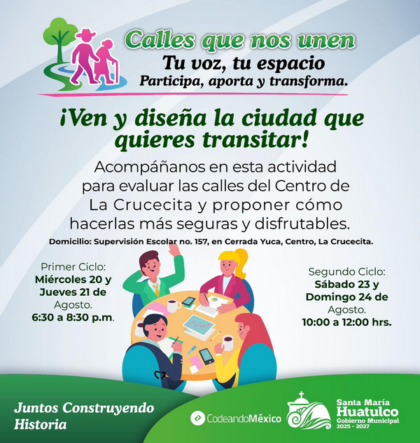 El Gobierno Municipal de Santa María Huatulco, que preside el Ing. Julio Cárdenas, a través de Codeando México, invita a la ciudadanía a sumarse al proyecto Calles Que Nos Unen, una iniciativa que busca promover la participación ciudadana en la construcción de espacios públicos más seguros, accesibles y disfrutables.