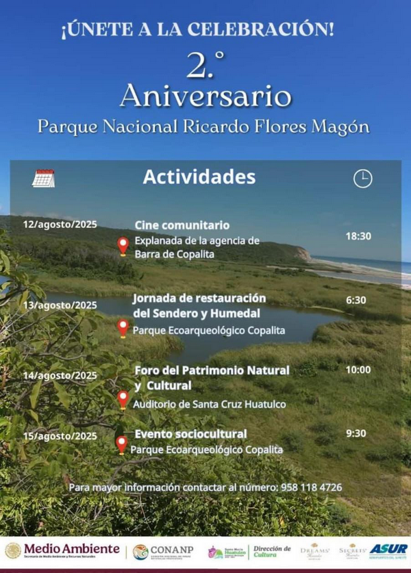 Del 12 al 15 de agosto de 2025, se llevarán a cabo diversas actividades conmemorativas por el 2.º Aniversario del Parque Nacional Ricardo Flores Magón, iniciativa impulsada por el Gobierno Municipal de Santa María Huatulco, a través de la Dirección de Cultura, Turismo, la Secretaría de Medio Ambiente y Recursos Naturales, la Comisión Nacional de Áreas Naturales Protegidas (CONANP), Dreams Huatulco, Secrets Huatulco y el Aeropuerto Internacional de Huatulco (ASUR).