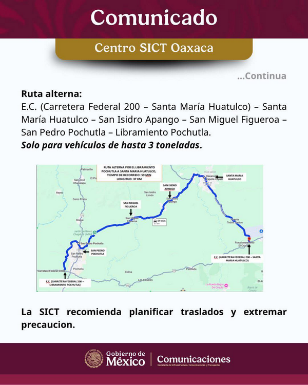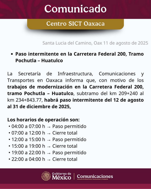 De acuerdo con el comunicado emitido por el Centro SICT Oaxaca, del 12 de agosto al 31 de diciembre de 2025, se realizará paso intermitente en la carretera federal 200, tramo Pochutla–Huatulco, debido a trabajos de modernización.