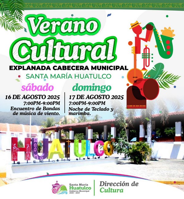 El Gobierno Municipal de Santa María Huatulco, que preside el Ing. Julio Cárdenas, a través de la Dirección de Cultura, te invita a disfrutar este 16 y 17 de agosto el Verano Cultural, un espacio para disfrutar en familia y vivir una tarde llena de alegría.