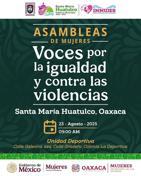 El Gobierno Municipal de Santa María Huatulco, que preside el Ing. Julio Cárdenas, a través del Instituto Municipal de las Mujeres (IMMUJER), en coordinación con la Secretaría de las Mujeres del Gobierno de México y la Secretaría de las Mujeres del Estado de Oaxaca, llevará a cabo la asamblea “Voces por la Igualdad y contra las Violencias”