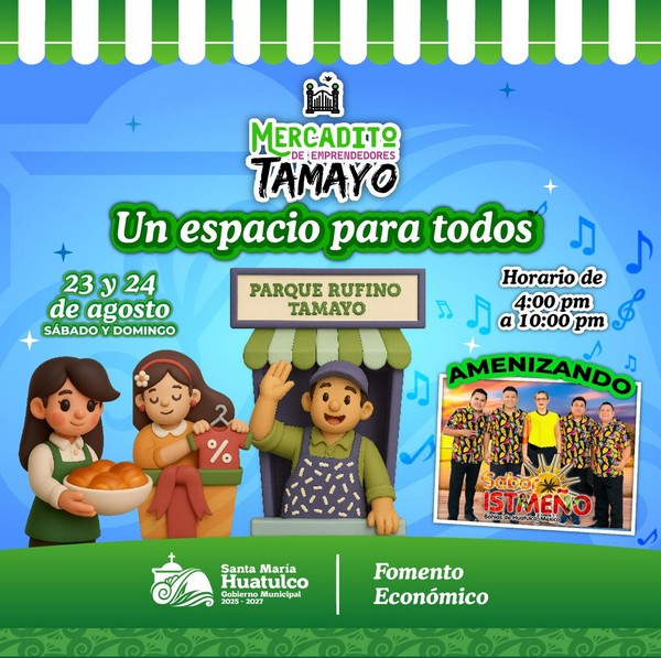 El Gobierno Municipal de Santa María Huatulco te invita a disfrutar este 23 y 24 de agosto del Mercadito de Emprendedores Tamayo, un espacio para apoyar el talento local, disfrutar en familia y vivir una tarde llena de alegría.
