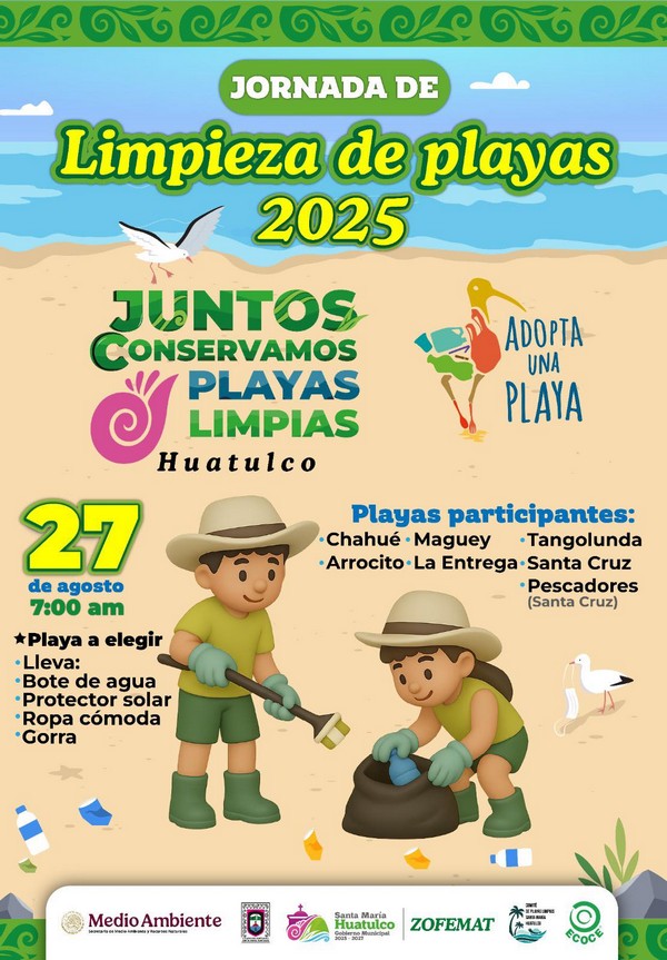 En el marco del proyecto Juntos Conservamos Playas Limpias Huatulco, el Gobierno Municipal de Santa María Huatulco, que preside el Ing. Julio Cárdenas, a través de la Dirección de la Zona Federal Marítimo Terrestre (ZOFEMAT) y en coordinación con la Secretaría de Medio Ambiente y Recursos Naturales, el Comité de Playas Limpias Santa María Huatulco y Ecología y Compromiso Empresarial (ECOCE), invita a la ciudadanía a participar en la jornada de limpieza de playas 2025.