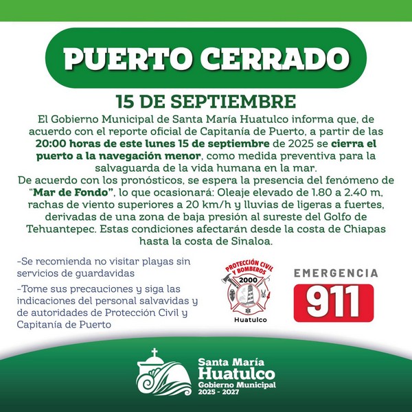 De acuerdo con el reporte oficial emitido por la Capitanía de Puerto en Huatulco, se cierra el puerto a la navegación menor.