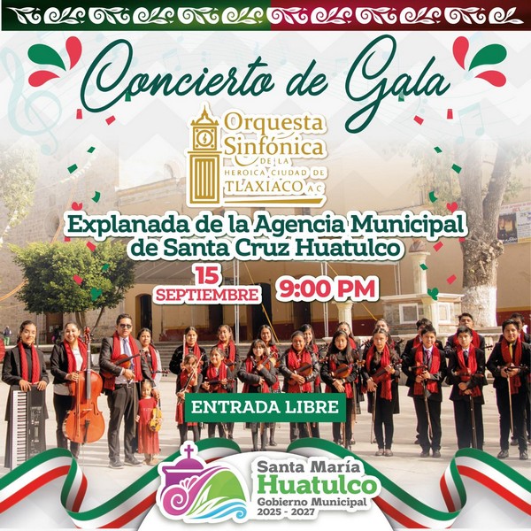 El Gobierno Municipal de Santa María Huatulco, que preside el Ing. Julio Cárdenas, invita a toda nuestra ciudadanía al gran concierto de gala que nos dará la Orquesta Sinfónica de la Heroica Ciudad de Tlaxiaco.