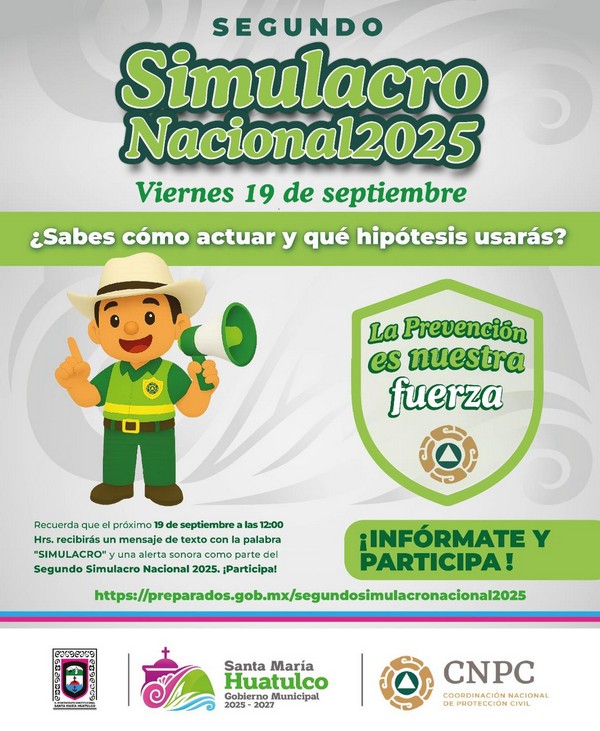 El Gobierno Municipal de Santa María Huatulco invita a la ciudadanía a participar en el Segundo Simulacro Nacional 2025, una acción de prevención organizada a nivel nacional para fortalecer la cultura de la protección civil.