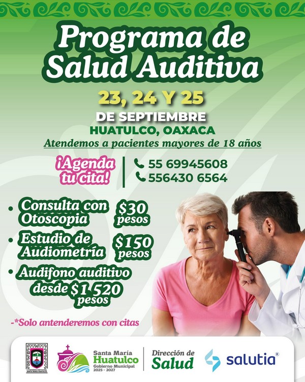 El Gobierno Municipal de Santa María Huatulco, que encabeza el Ing. Julio Cárdenas, a través de la Dirección de Salud y en coordinación con Salutia, invita a la ciudadanía mayor de 18 años a participar en el Programa de Salud Auditiva.