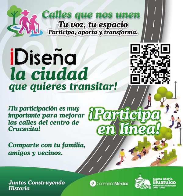 El Gobierno Municipal de Santa María Huatulco, que preside el Ing. Julio Cárdenas, a través de Codeando México, invita a la ciudadanía a sumarse al proyecto Calles Que Nos Unen, una iniciativa que busca promover la participación ciudadana en la construcción de espacios públicos más seguros, accesibles y disfrutables.