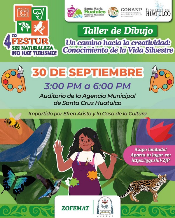 El Gobierno Municipal de Santa María Huatulco, que preside el Ing. Julio Cárdenas, en coordinación con la Comisión Nacional de Áreas Naturales Protegidas, el CONANP-Parque Nacional Huatulco y la Casa de la Cultura, invita a participar en el Taller de Dibujo: “Un camino hacia la creatividad, conocimiento de la vida silvestre”.