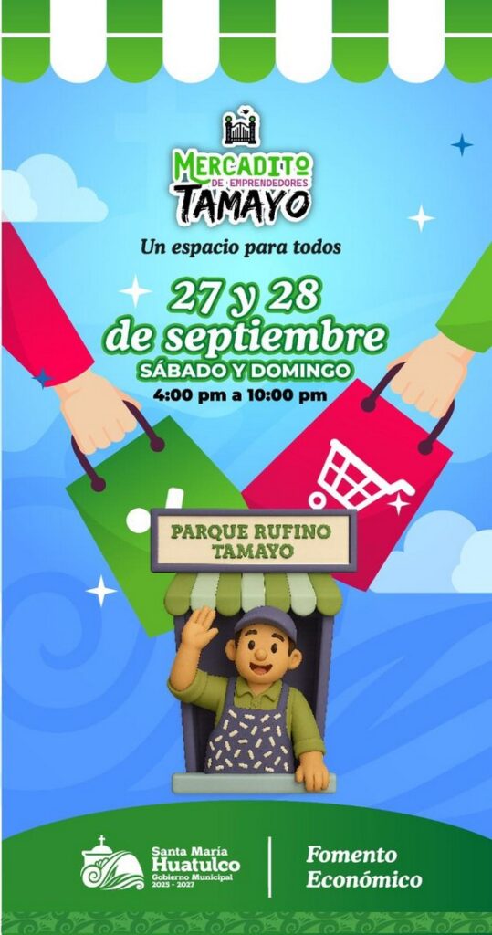 El Gobierno Municipal de Santa María Huatulco te invita a disfrutar este 27 y 28 de septiembre del Mercadito de Emprendedores Tamayo, un espacio para apoyar el talento local, disfrutar en familia y vivir una tarde llena de alegría.