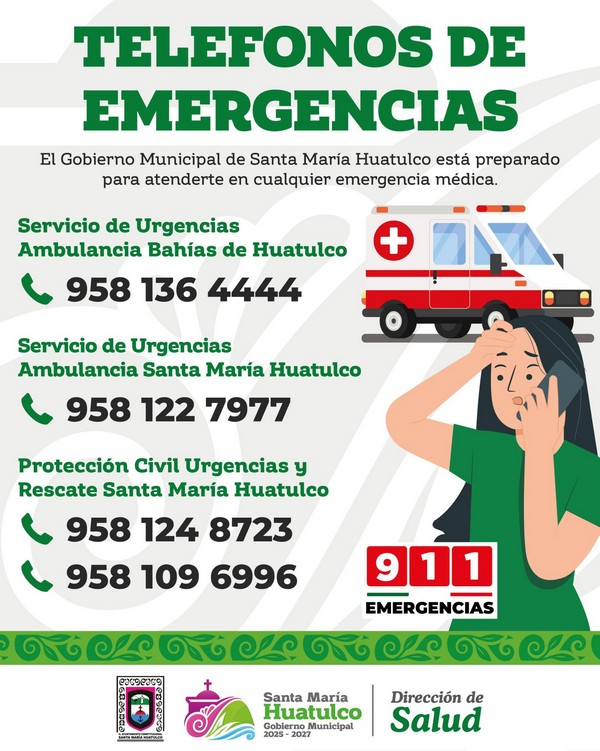 🚑 Además, el Gobierno Municipal de Santa María Huatulco pone a tu disposición los números de Salud y Protección Civil, para atender urgencias médicas y de rescate.