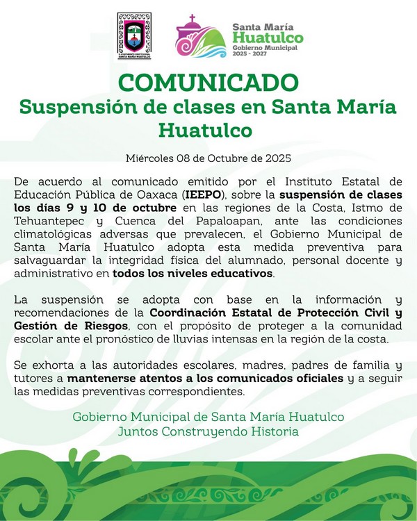 Suspensión de clases en todos los niveles académicos los días 9 y 10 de octubre en Santa María Huatulco. Navegación de entradas JORNADAS MÉDICAS DE EXPLORACIÓN COMUNICADO OFICIAL