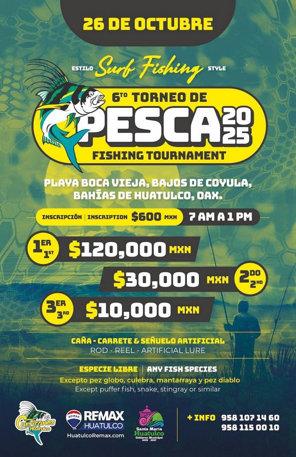 El Gobierno Municipal de Santa María Huatulco, que preside el Ing. Julio Cárdenas, en coordinación con el Club de Pesca Los Curricanes, invita a la ciudadanía al 6º Torneo de Pesca 2025, estilo Surf Fishing.