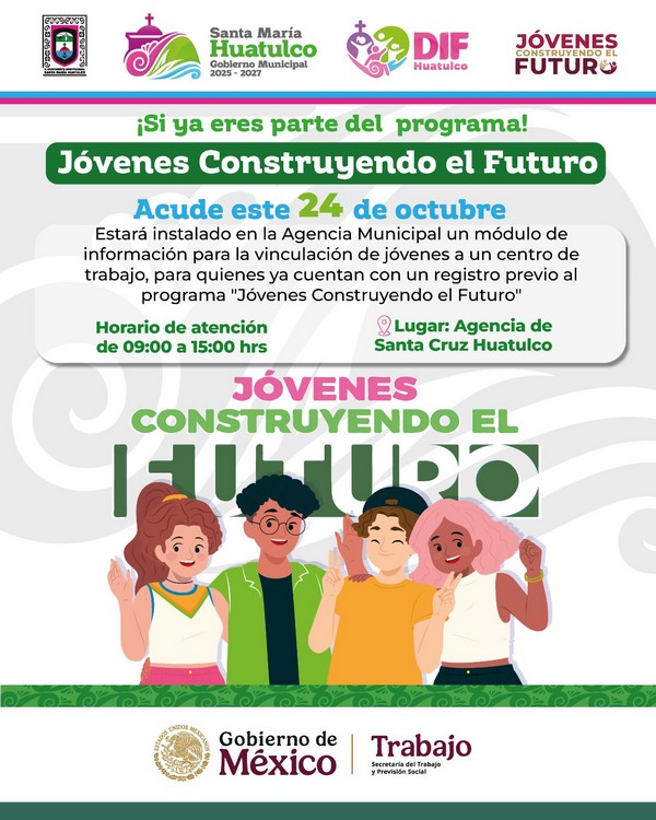 El Gobierno Municipal de Santa María Huatulco, que preside el Ing. Julio Cárdenas, invita a quienes forman parte del programa “Jóvenes Construyendo el Futuro” a acudir este 24 de octubre al módulo de atención e información que se instalará en la Agencia Municipal de Santa Cruz Huatulco.