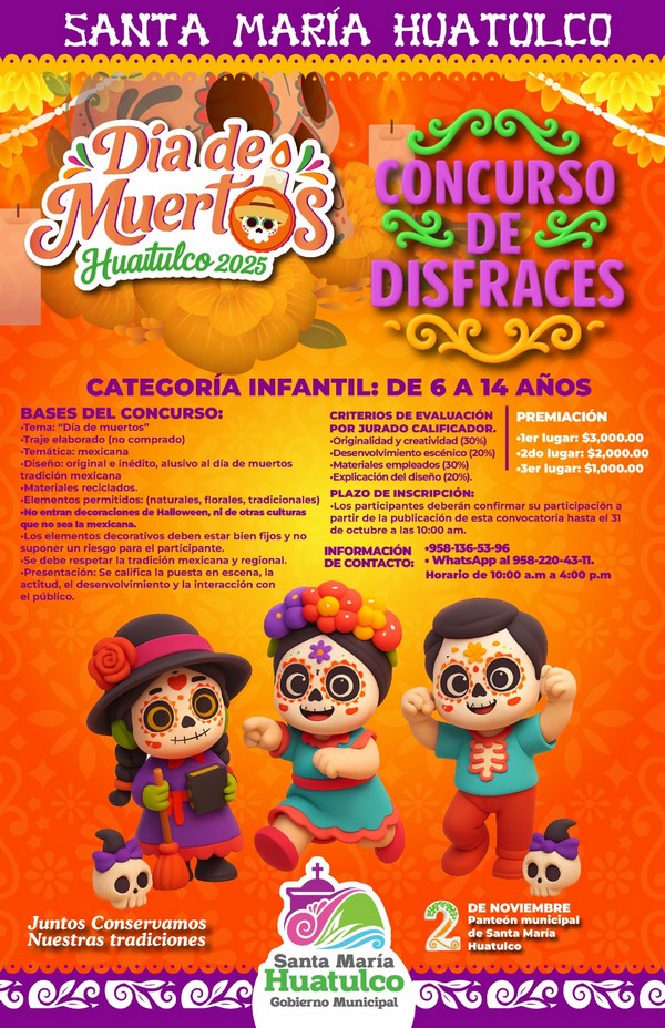 El Gobierno Municipal de Santa María Huatulco, que preside el Ing. Julio Cárdenas, invita a participar en el Concurso de Disfraces Mexicanos alusivos al Día de Muertos, categoría infantil (de 6 a 14 años).