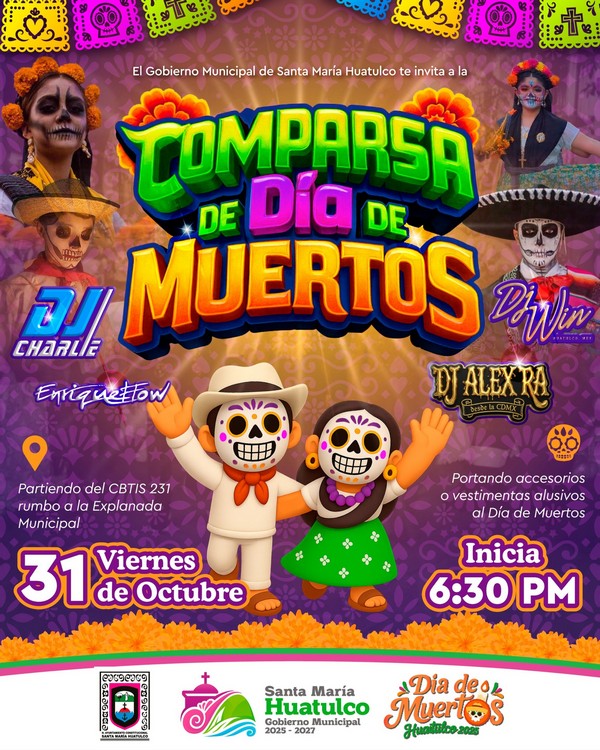 El Gobierno Municipal de Santa María Huatulco, que preside el Ing. Julio Cárdenas, invita a participar a la comparsa de Día de Muertos.