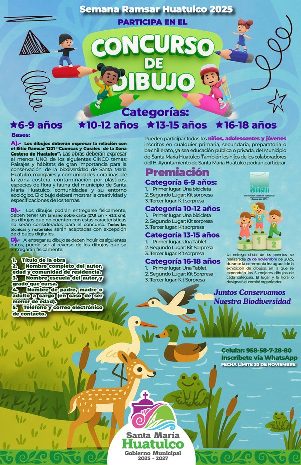 El Gobierno Municipal de Santa María Huatulco, que preside el Ing. Julio Cárdenas, a través de la Dirección de Sustentabilidad, invita al Concurso de Dibujo Infantil y Juvenil “Semana Ramsar Huatulco 2025”, con el objetivo de fomentar la educación ambiental y la conservación del Sitio Ramsar 1321 “Cuencas y Corales de la Zona Costera de Huatulco.”