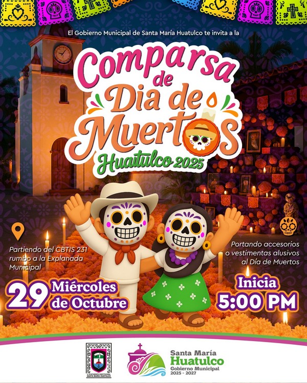 El Gobierno Municipal de Santa María Huatulco, que preside el Ing. Julio Cárdenas, invita a participar a la primera comparsa de Día de Muertos.