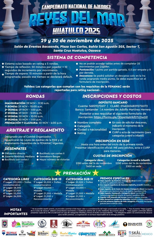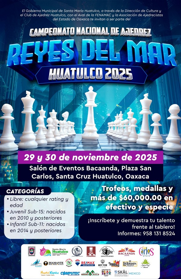 El Gobierno Municipal de Santa María Huatulco, que preside el Ing. Julio Cárdenas, a través de la Dirección de Cultura, el Club de Ajedrez Huatulco, el aval de la FENAMAC y la Asociación de Ajedrecistas del Estado de Oaxaca, invita a participar en el Campeonato Nacional de Ajedrez “Reyes del Mar” Huatulco 2025.