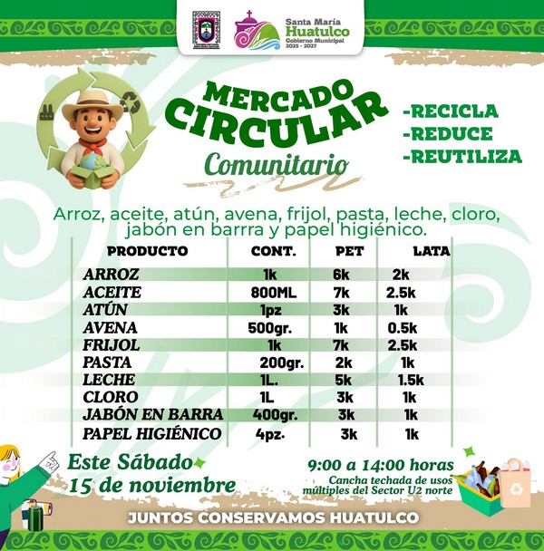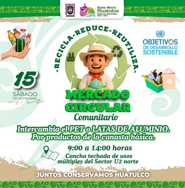 Con el objetivo de cuidar nuestro medio ambiente y la salud de nuestras familias, el Gobierno Municipal de Santa María Huatulco, que preside el Ing. Julio Cárdenas, a través de la Dirección de Sustentabilidad, invita a la ciudadanía a participar en el Mercado Circular Comunitario.