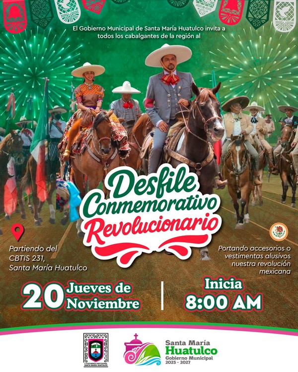 El Gobierno Municipal de Santa María Huatulco, que preside el Ing. Julio Cárdenas, invita a las y los cabalgantes de la región al Desfile Conmemorativo Revolucionario.