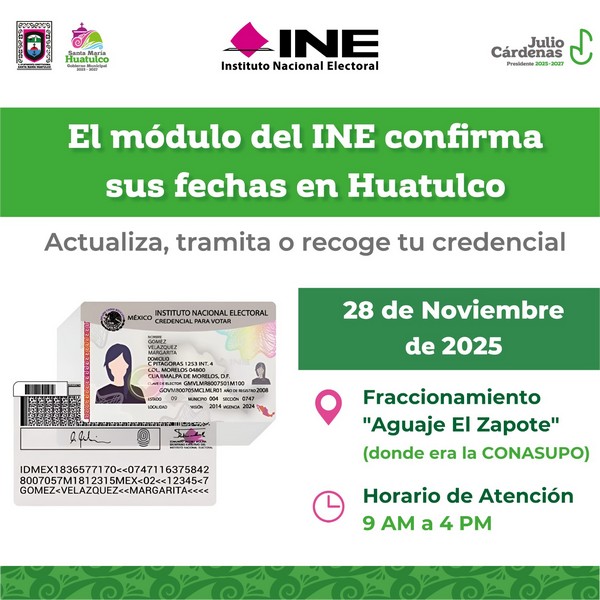 El Gobierno Municipal de Santa María Huatulco, que preside el Ing. Julio Cárdenas, invita a la comunidad a acudir al módulo del Instituto Nacional Electoral (INE México), que estará disponible para brindar atención en actualización, trámite o entrega de credenciales.