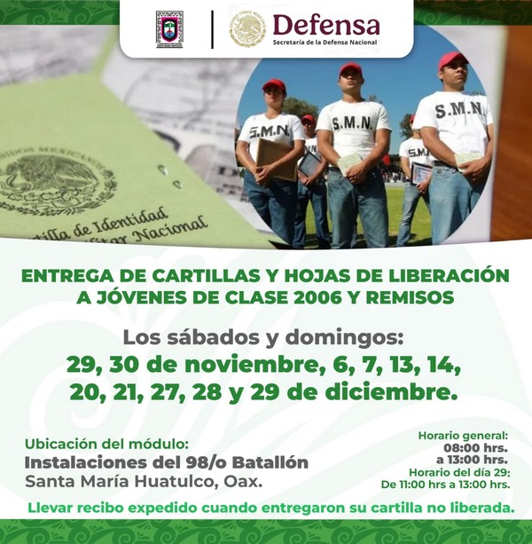 La Secretaría de la Defensa Nacional llevará a cabo la entrega de cartillas y hojas de liberación a jóvenes de la Clase 2006 y remisos.