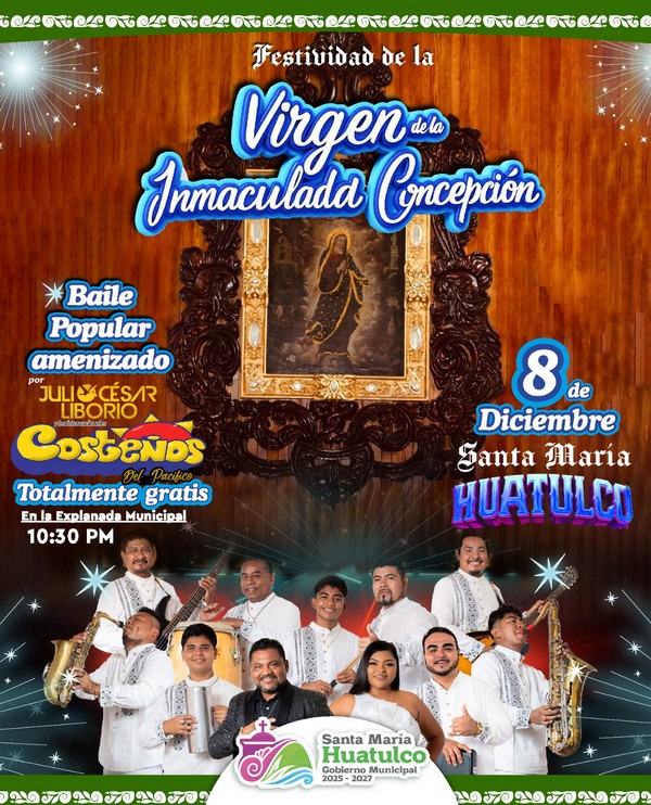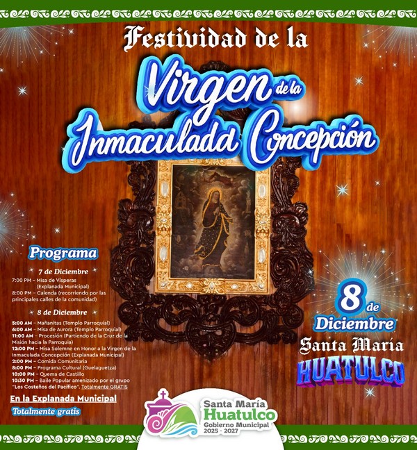 El Gobierno Municipal de Santa María Huatulco, que preside el Ing. Julio Cárdenas, invita a la ciudadanía a participar en la Festividad de la Virgen de la Inmaculada Concepción, una actividad que reunirá a familias y comunidades para honrar esta importante tradición.