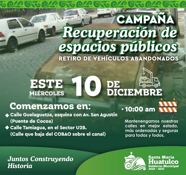 El Gobierno Municipal de Santa María Huatulco, que preside el Ing. Julio Cárdenas, a través de la Dirección de Vialidad y Prevención al Delito, inicia campaña de recuperación de espacios públicos retirando vehículos abandonados para mantener las calles más ordenadas y seguras para todas y todos.