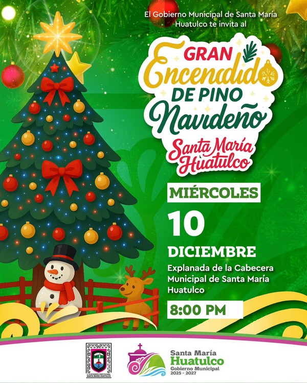 El Gobierno Municipal de Santa María Huatulco invita a la ciudadanía a ser parte del encendido del tradicional pino navideño.